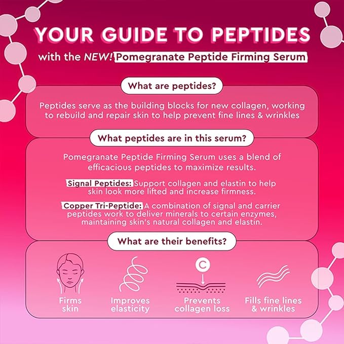 - Packed with Polypeptides - Our clinically effective, skin firming peptide serum hydrates, smoothes and nourishes your complexion while helping to prevent and treat fine lines over time. Formulated with juicy, antioxidant-rich pomegranates and copper peptides that maintain the skin's natural collagen and prevent future damage.
