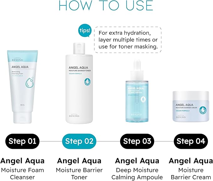 - BEYOND ANGEL AQUA MOISTURE BARRIER TONER (500ml/16.9fl oz) - This toner offers a holistic approach to skincare, combining gentle exfoliation, moisturization, and barrier enhancement in one multitasking formula. Its rich texture penetrates deep into the skin, delivering intense nourishment and moisture.