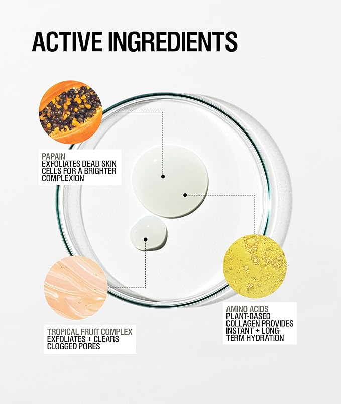 - EXFOLIATING. Formulated with Papain and Amino Acids. The complexion looks radiant, with a healthy glow