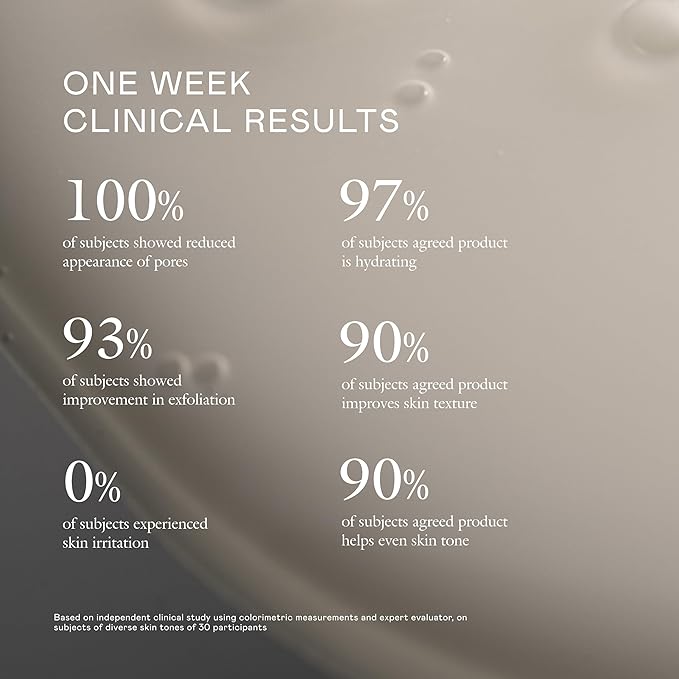 - VEGAN & CLINICALLY TESTED ON DIVERSE SKIN TONES: In a clinical study with an expert evaluator of 30 participants across a range of skin tones, after one week of testing: 100% saw a reduction in the appearance of pore size. 93% showed visible improvement in exfoliation, 97% agreed the product felt hydrating, and 0% experienced skin irritation.