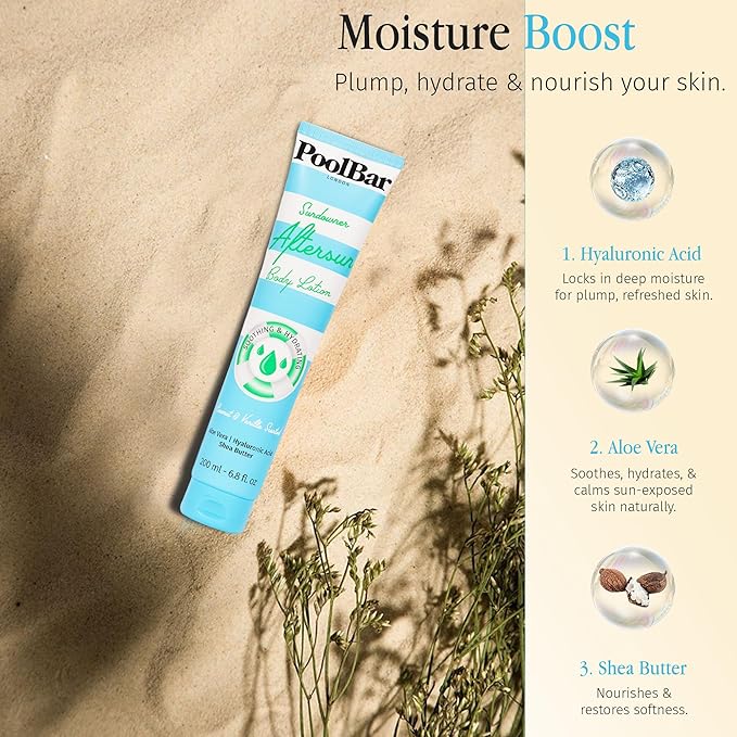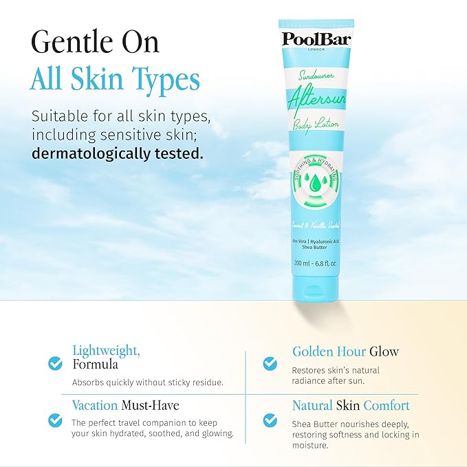 - ππππ πππππππππ: PoolBar sundowner aftersun lotion hydrates your skin intensely, much like a refreshing drink of water. It ensures your skin feels rejuvenated after sun exposure. This deep hydration helps maintain your skin's natural moisture balance.
